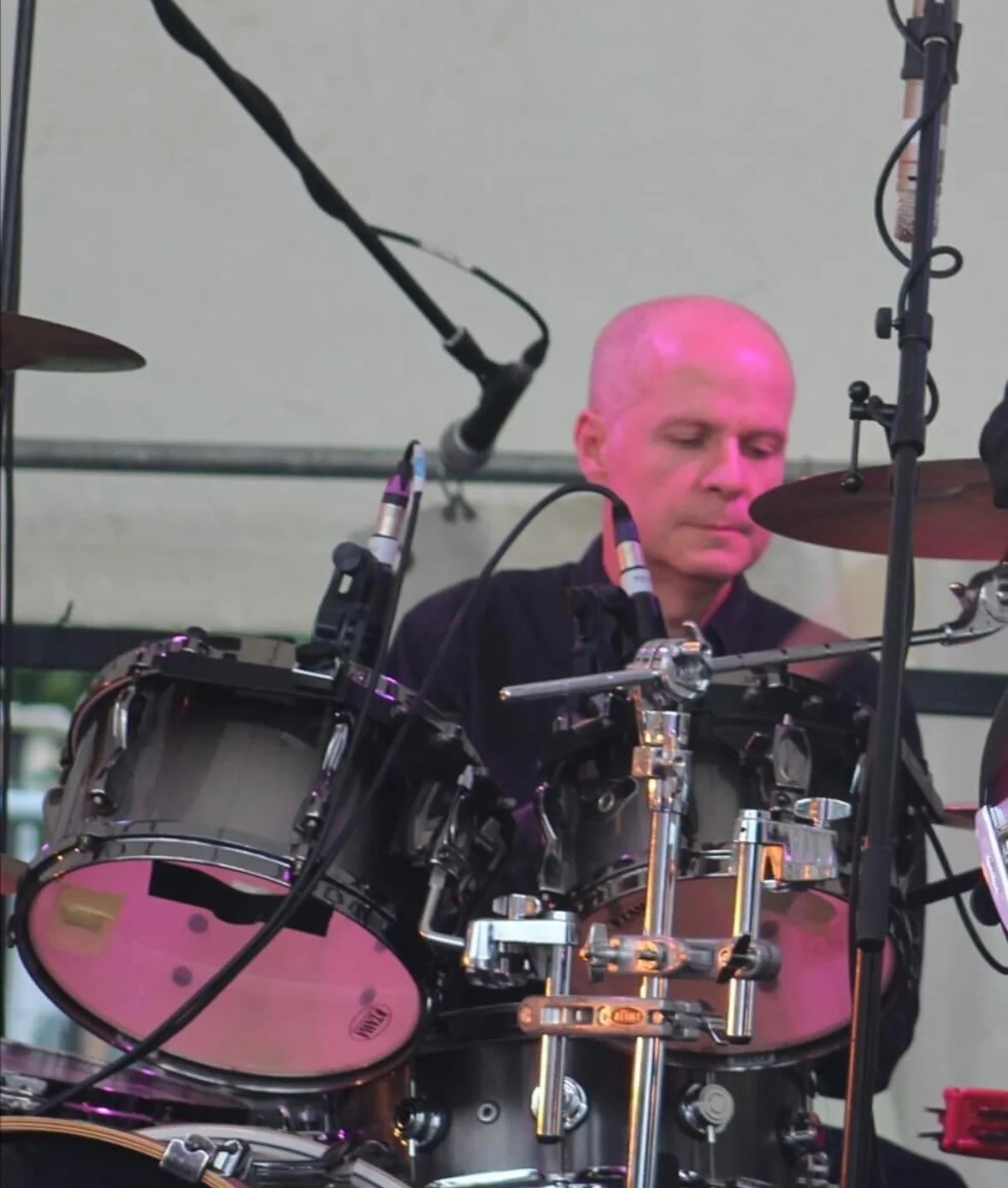 Not as grumpy as he normally looks! Simon has been with Rhythm Street since the beginning and has never looked back, first-rate drummer and loyal to the end.